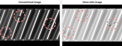 For the inspection of the sides of cylindrical targets, it was difficult to apply lighting evenly. With a line scan camera, images of cylindrical shapes can be captured continuously. Also, LumiTrax™ specular reflection mode allows for the detection of linear flaws, dents, and stains with a single captured image.