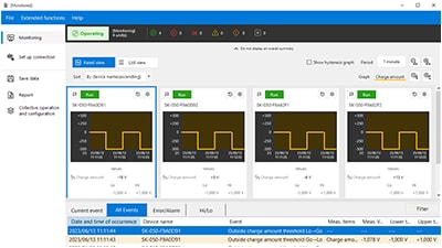 Thông số tiêu chuẩn bao gồm hệ thống đánh giá 3 ngõ ra độc lập và ngõ ra analog điện áp/dòng điện để thu thập và xuất dữ liệu điện tích tĩnh của vật thể cũng như nhiệt độ và độ ẩm của môi trường xung quanh. Thông qua bộ truyền thông, dữ liệu từ tối đa 8 thiết bị chính và khối mở rộng có thể được truyền đồng thời. Khả năng đọc dữ liệu và thiết lập lại từ máy tính hoặc PLC giúp giảm đáng kể thời gian thiết lập và vận hành.