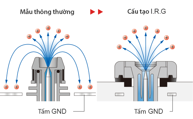 Trong các mẫu thông thường, tấm nối đất GND – cần thiết cho quá trình tạo ion – được lắp bên ngoài. Tuy nhiên, Sê-ri SJ-H của KEYENCE là thiết bị đầu tiên áp dụng cấu trúc I.R.G. (Insert Ring Ground – Nối đất vòng đệm), bao gồm tấm bên trong thiết bị I-ôn hóa. Bằng cách hướng các ion đã tạo đến mục tiêu thay vì tấm nối đất GND, tổn thất giảm xuống tối thiểu và số lượng ion áp dụng cho mục tiêu tăng lên. Điều này cho phép khử tĩnh điện tốc độ cao nhanh hơn năm lần so với mẫu thông thường.
