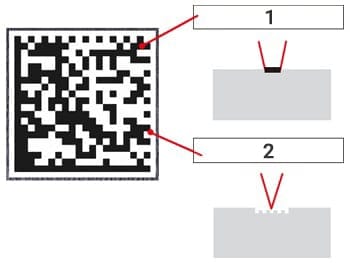 Khắc mã 2D tạo ra sự tương phản giữa màu đen và màu trắng thông qua quá trình chạm khắc và oxy hóa. Điểm mấu chốt là sử dụng khắc màu trắng với lấy nét chính xác và khắc màu đen với lấy nét mờ. Các kích thước điểm vệt tia biến thiên của chức năng khắc 3D là một cách tiếp cận hiệu quả.