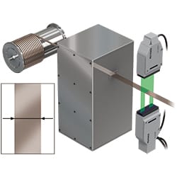 Đo độ dày được thực hiện bởi hai cảm biến kẹp sát mục tiêu. Đối với mục tiêu trong suốt, độ dày có thể được đo trực tiếp bằng cách chỉ cần chiếu từ một phía.