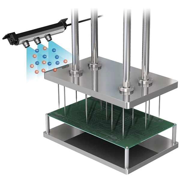 Vật thể lạ nằm giữa đầu dò và bảng mạch trong quá trình kiểm tra độ dẫn điện được coi là lỗi dẫn điện và có nghĩa là phép thử phải được lặp lại, làm giảm đáng kể hiệu suất. Các đầu dò nhạy cảm thậm chí có thể bị hư hỏng do tĩnh điện. Máy ion hóa có thể loại bỏ những vấn đề này.