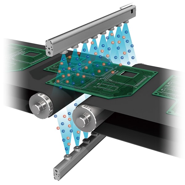 Trong quá trình vận chuyển, bảng mạch bị tích điện tĩnh do tiếp xúc và tách ra khỏi băng tải. Điện tích mạnh có thể dẫn đến sự phá hủy tĩnh điện và sự bám dính của các hạt lạ, do đó có thể gây ra lỗi sản xuất. Máy ion hóa có thể làm giảm những lỗi này bằng cách khử điện tích tĩnh.