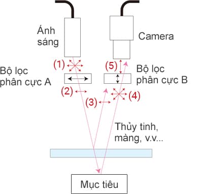 Ánh sáng (1) được phân cực với bộ lọc phân cực A vì vậy chỉ có ánh sáng ngang (2) được truyền đến mục tiêu. Do bộ lọc phân cực B được cài đặt chỉ tiếp nhận ánh sáng dọc, ánh sáng khuếch tán (3) phản xạ từ bề mặt màng sẽ bị từ chối. Tuy nhiên, ánh sáng phản xạ khuếch tán (4) từ mục tiêu có một thành phần dọc (5) nên được phép đi qua B đến camera.
