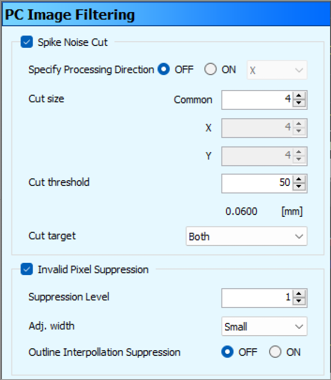 Set the PC image filtering (Spike Noise Cut and Invalid Pixel Suppression).