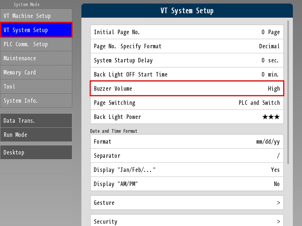 3. Tap [VT System Setup] -> [Buzzer Volume].