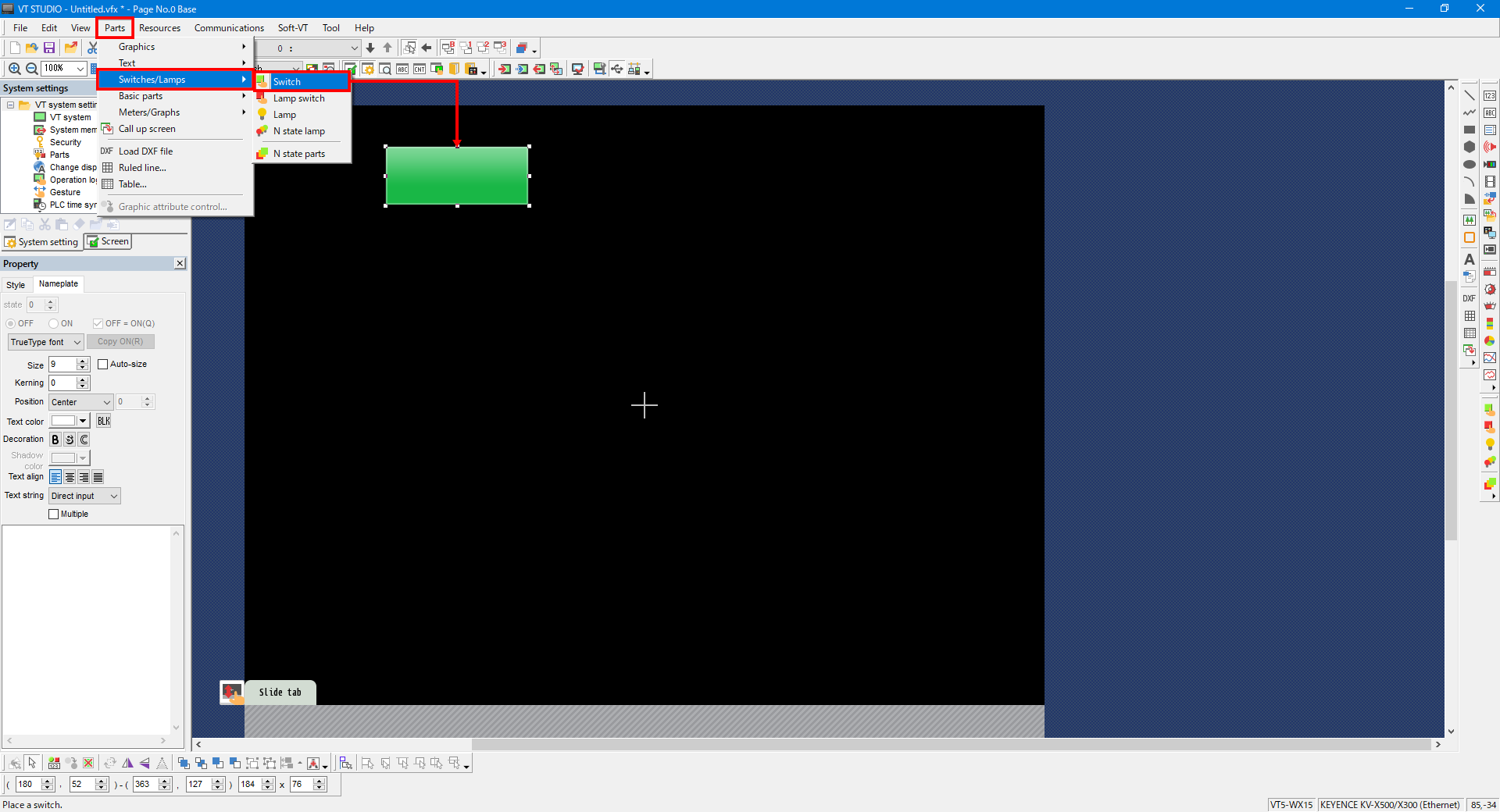 1. From the menu, select [Parts] -> [Switches/Lamps] -> [Switch], and then place a switch.