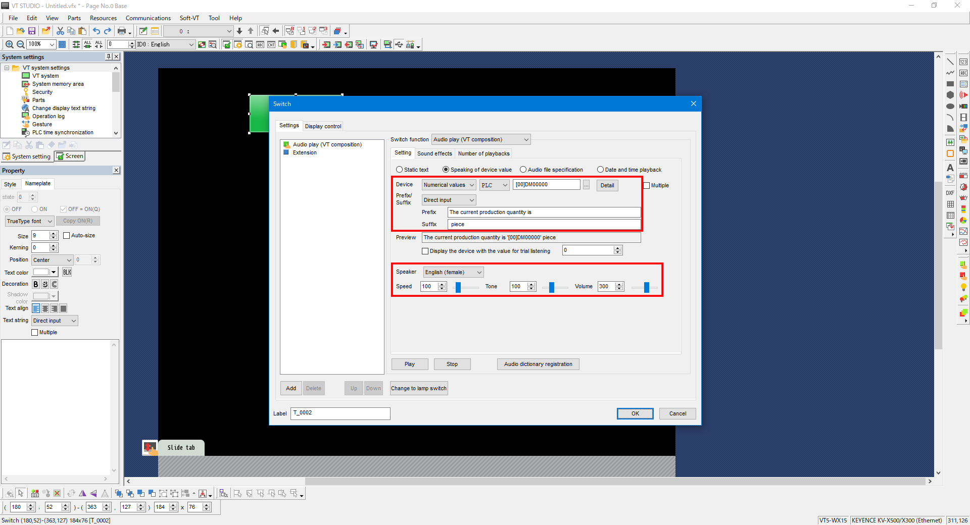 The example settings in the following figure are for using VT synthesis and playing back the audio message “The current production quantity is (device value of DM0) piece”