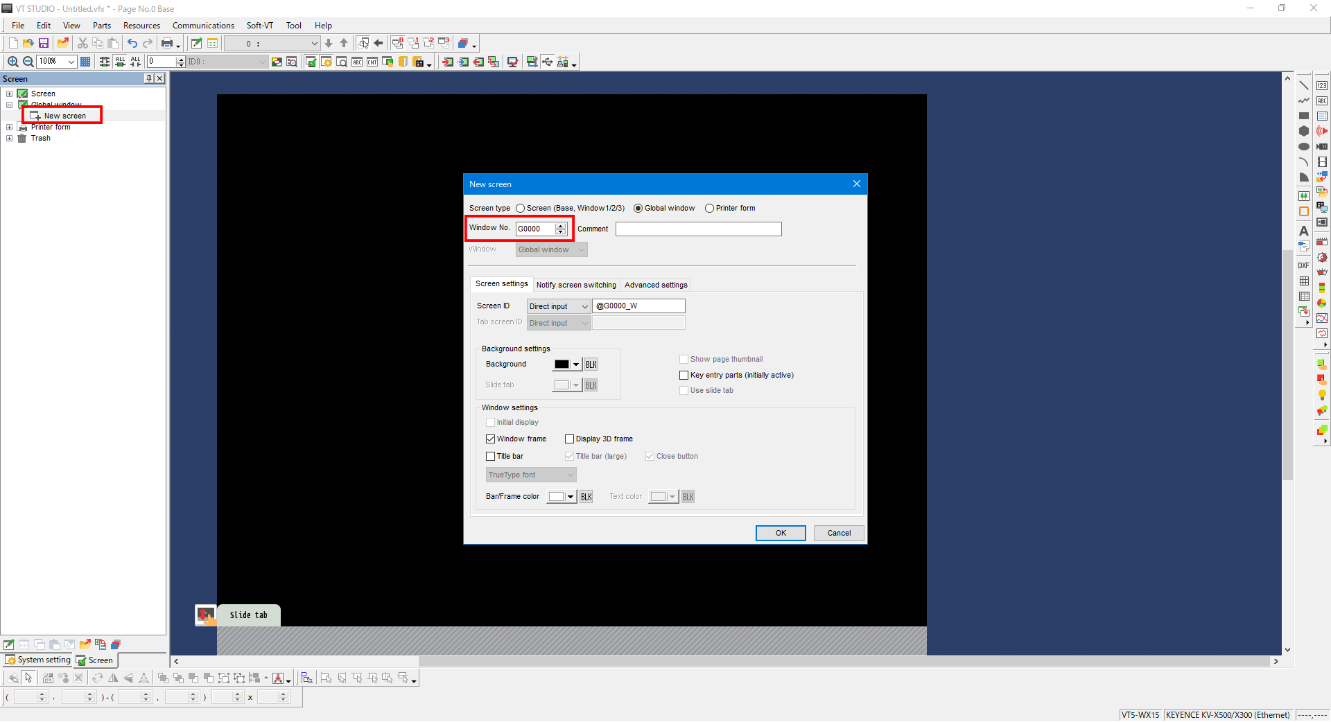 1. Click “Global window” -> “New screen.” The [New screen] dialog box is displayed. Specify the Window No., and then click [OK].