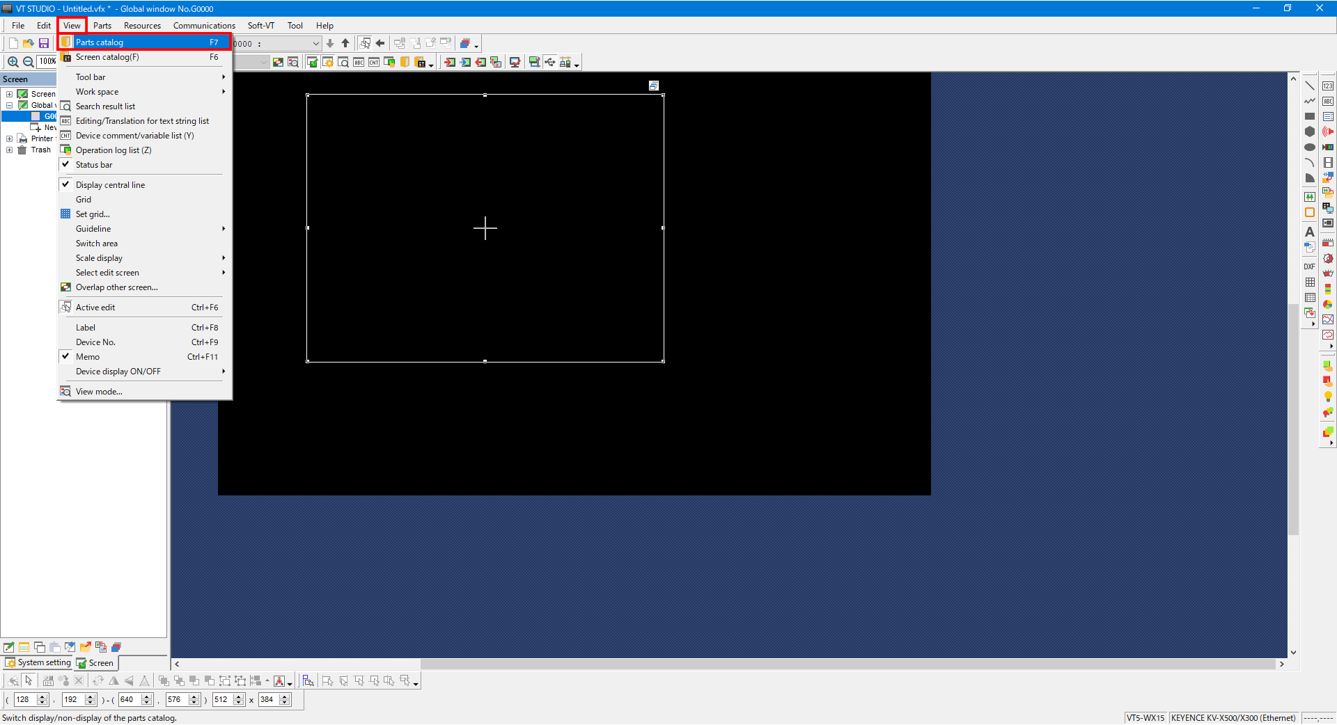 2. From the menu, select [View] -> [Parts catalog] to display the part catalog for selecting the keyboard.