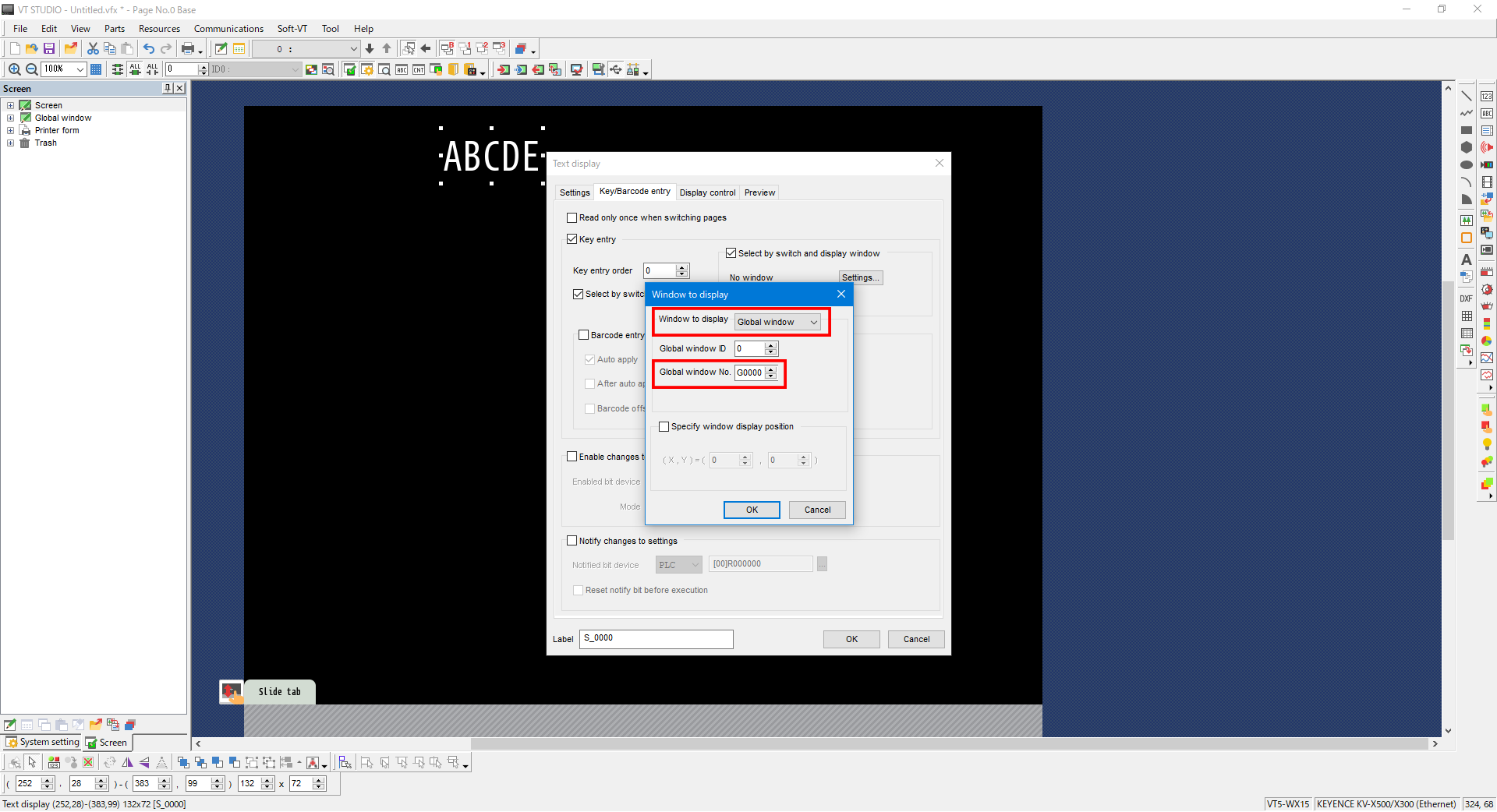 6. Open the text display part settings, configure the settings on the “Key/Barcode entry” tab as follows, and then click [Settings].