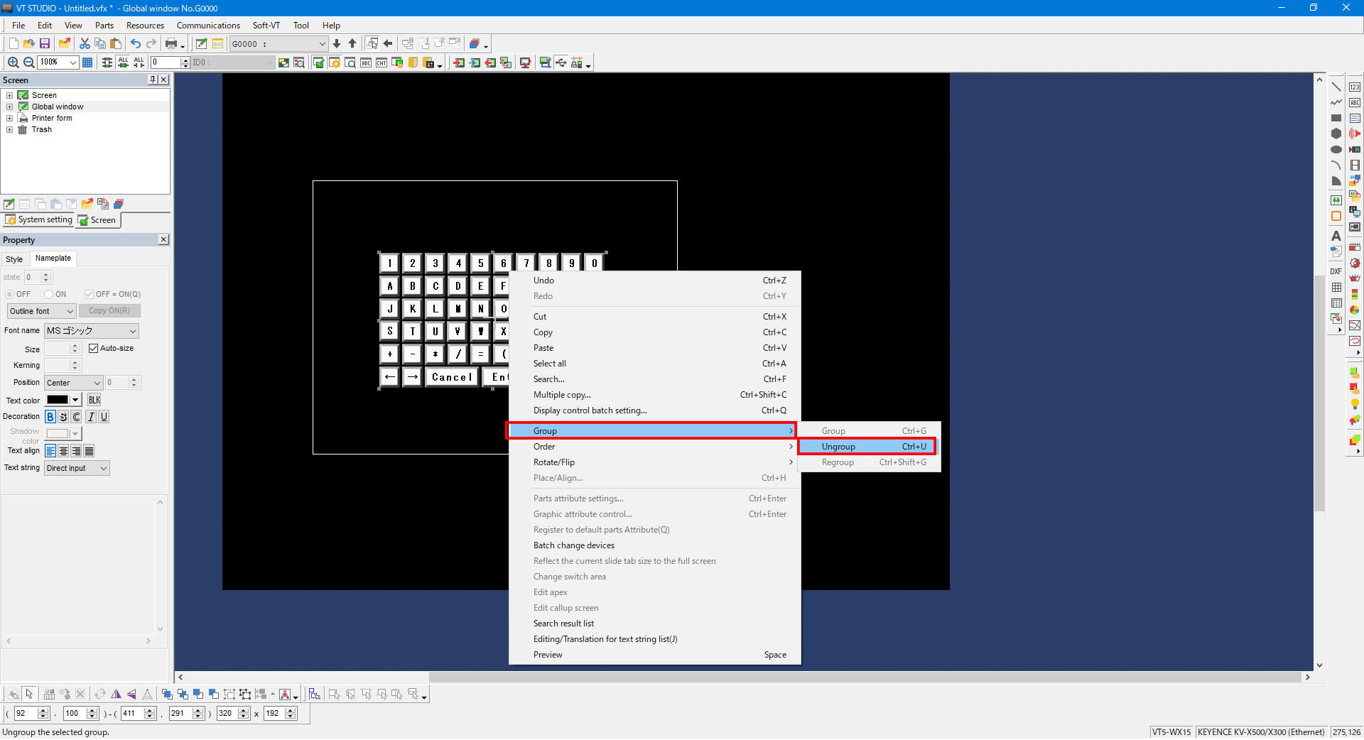 1. Right-click the keyboard part, and then select [Group] -> [Ungroup] from the menu that appears.