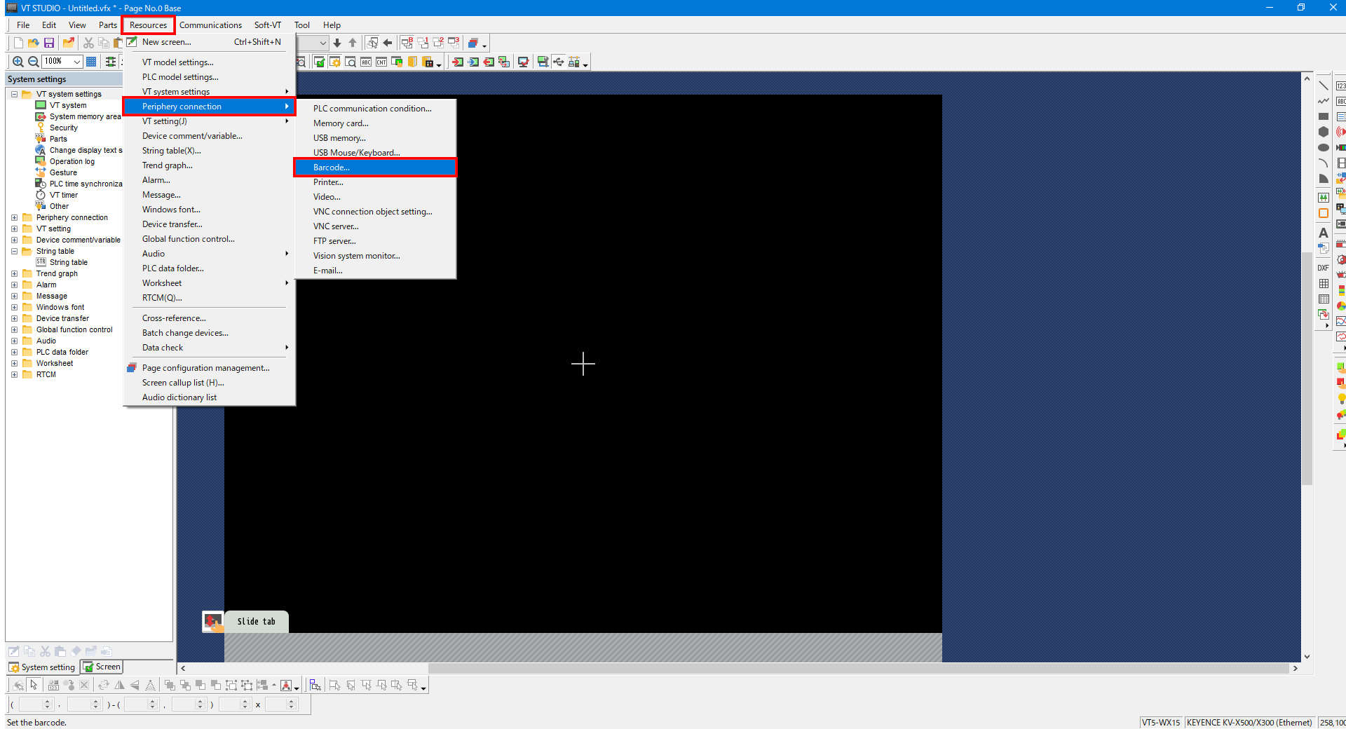 From the menu, select [Resources] -> [Periphery connection] -> [Barcode].