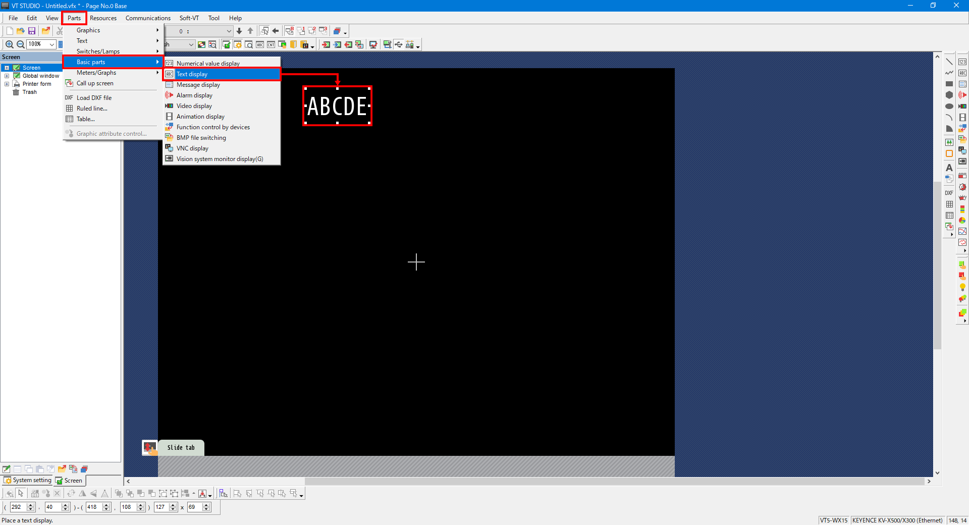 From the menu, select [Parts] -> [Basic parts] -> [Text display], and then place a text display part.
