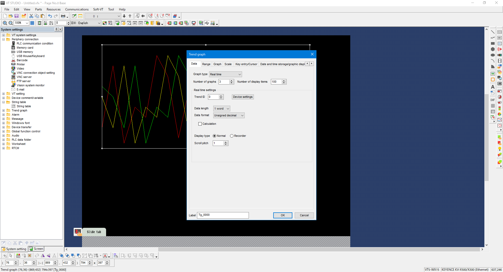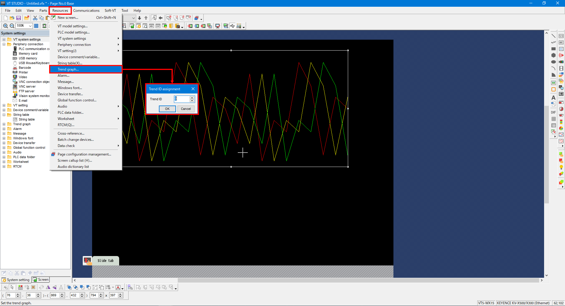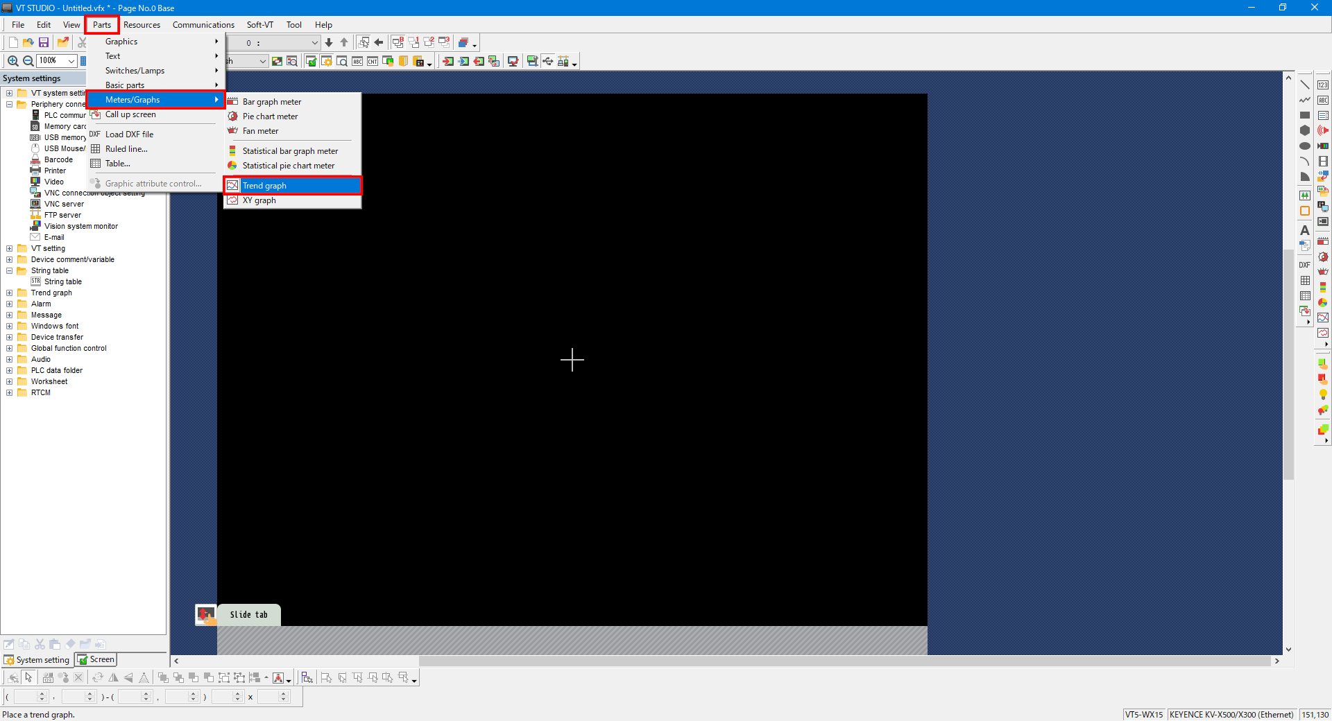 1. From the menu, select [Parts] -> [Meters/Graphs] -> [Trend graph], and then place a trend graph part.