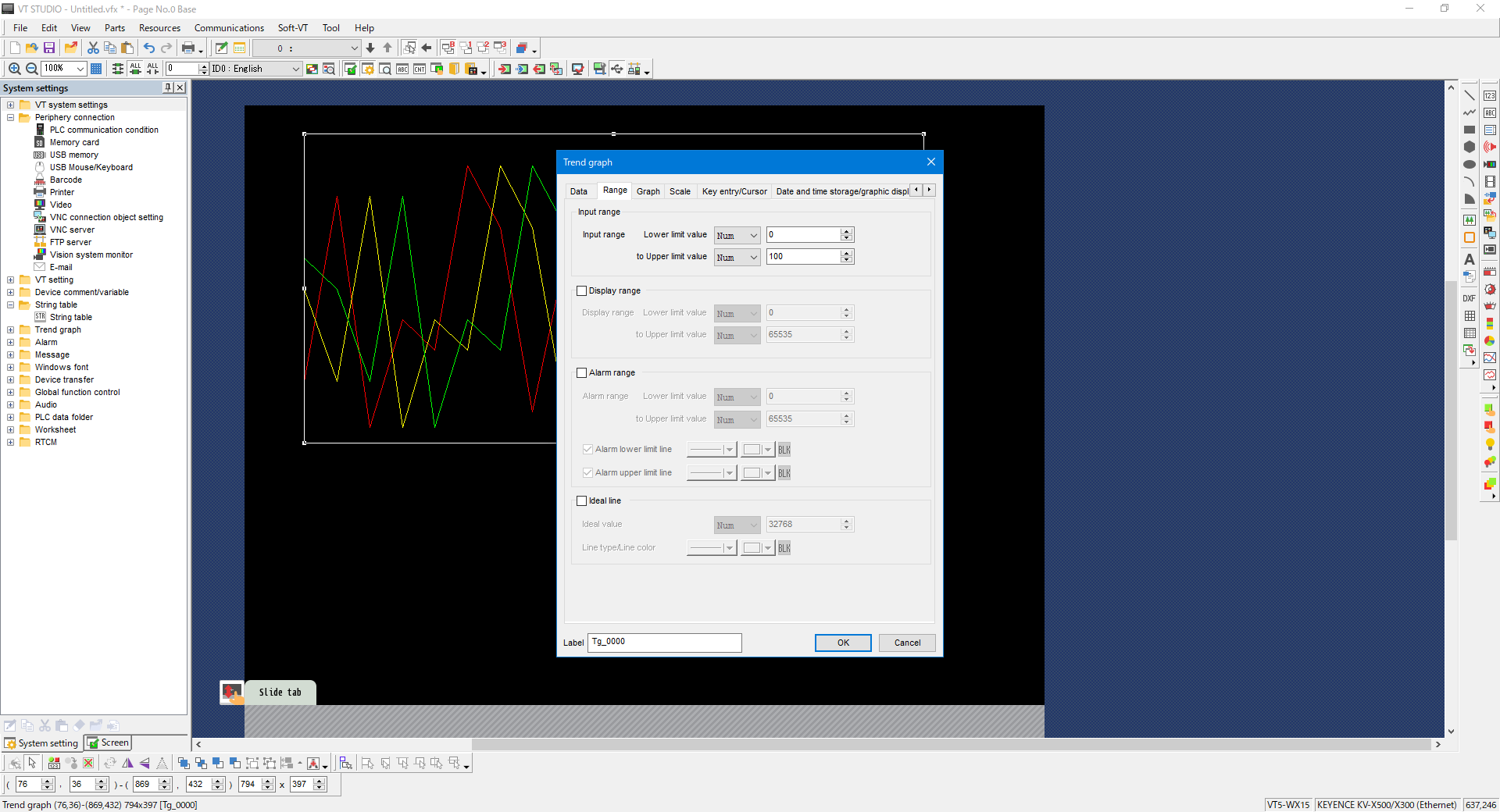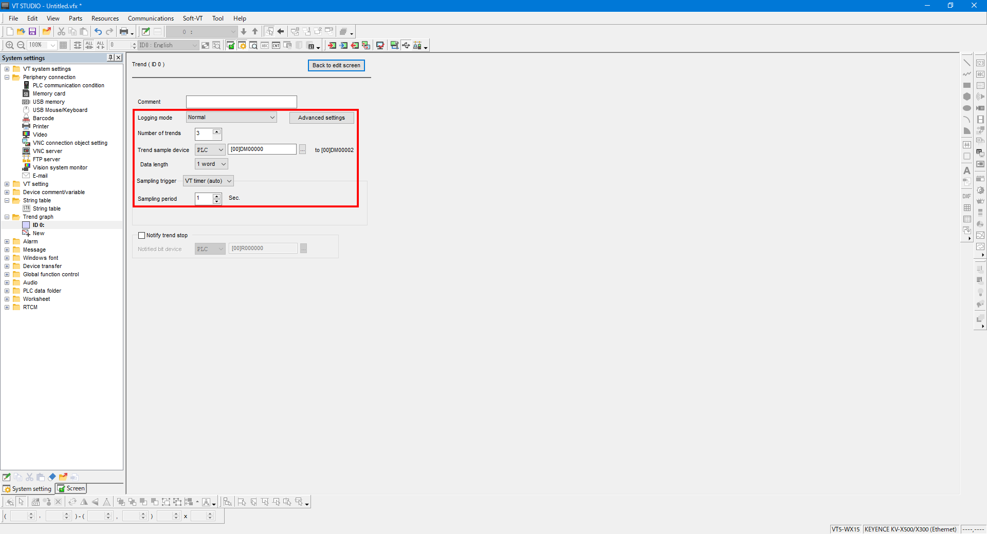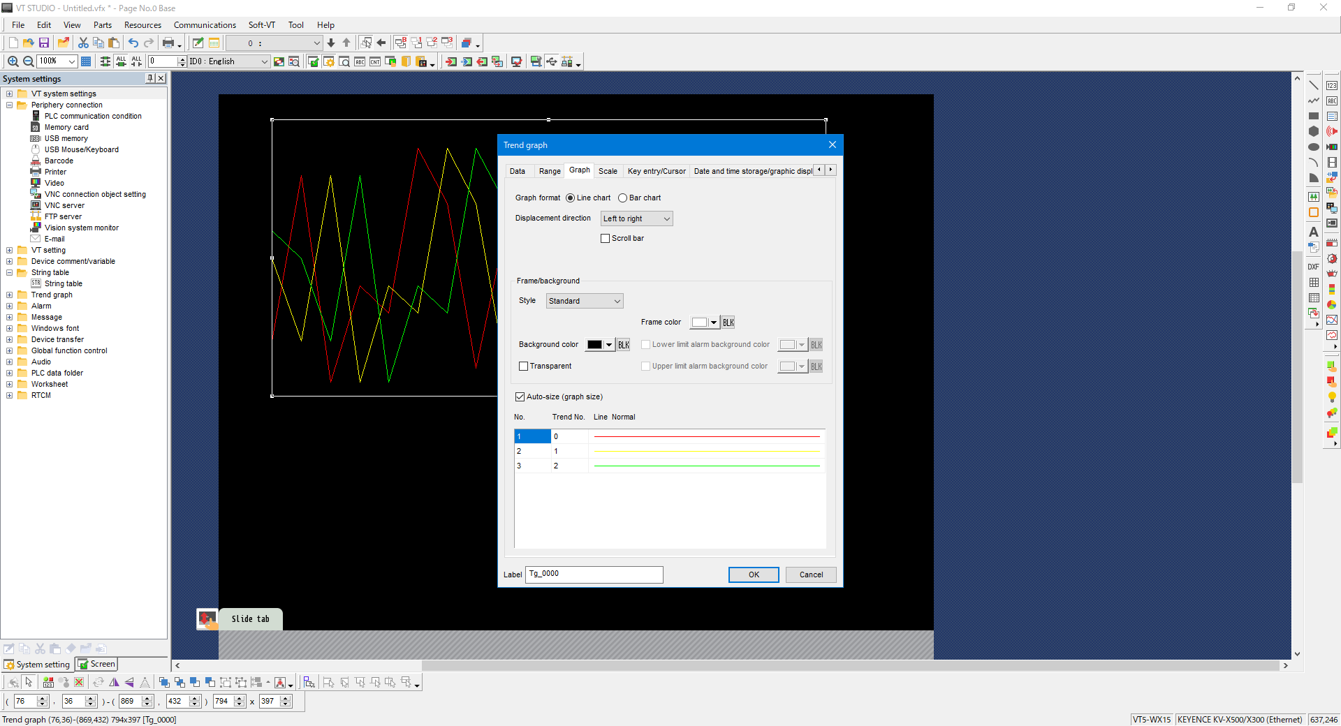 1. From the menu, select [Parts] -> [Meters/Graphs] -> [Trend graph], and then place a trend graph part.